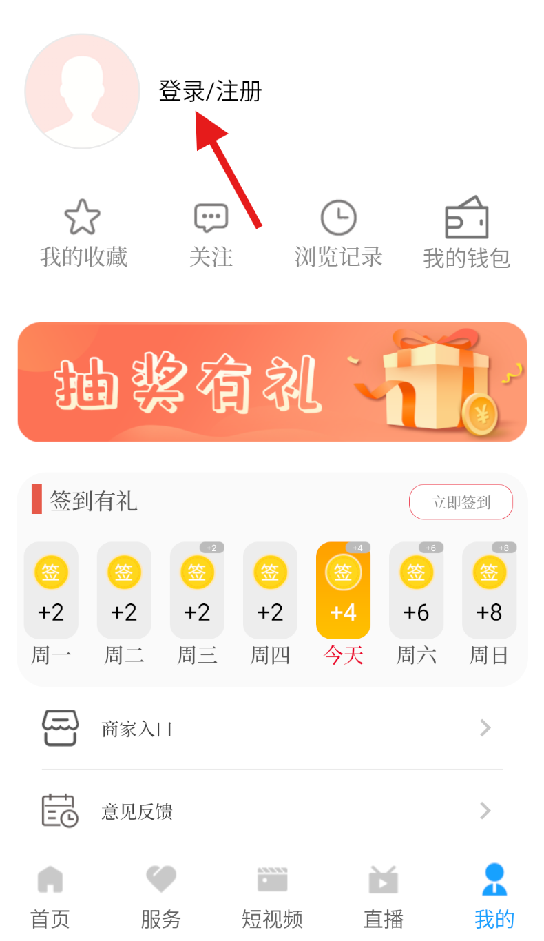 2、进入 “我的” 页面后,找到 “登录 / 注册” 选项并点击,跳转至账号的登录与注册界面。