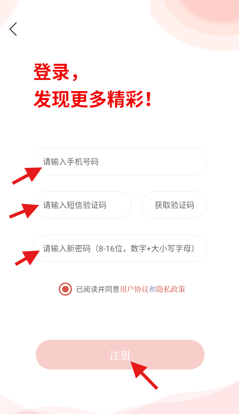 4、在该页面输入手机号及获取的验证码,再输入新设密码,确认无误后点击注册即可完成。
