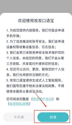 1、点击同意按钮,顺利进入炭炭口语宝应用,开启您的英语学习之旅,享受轻松愉快的学习过程。