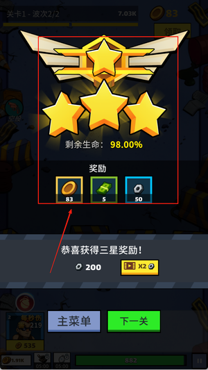 1、玩家可通过完成关卡获取金币与资源,用于升级武器、购买新装备或解锁更高级别的防御设施。