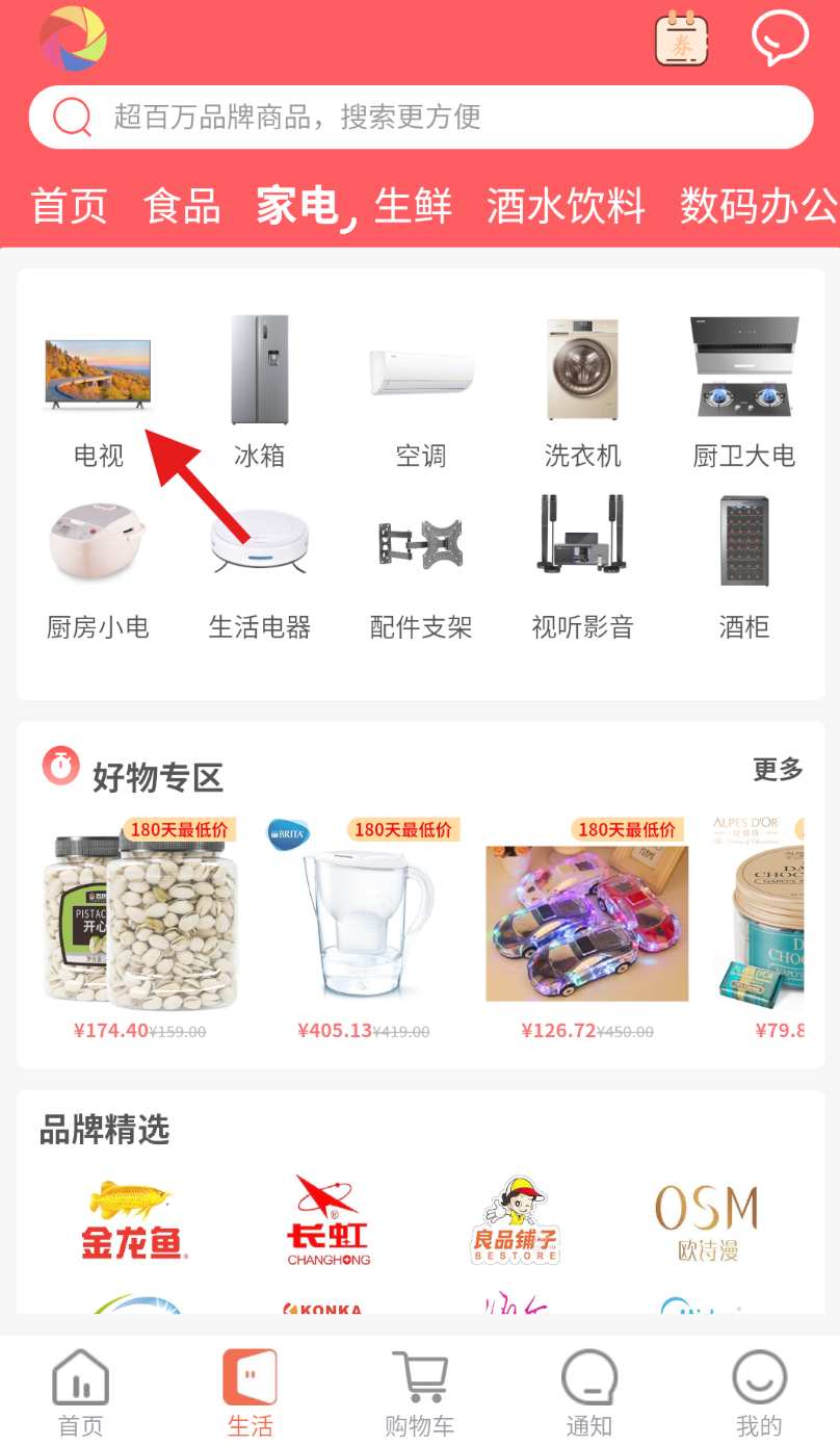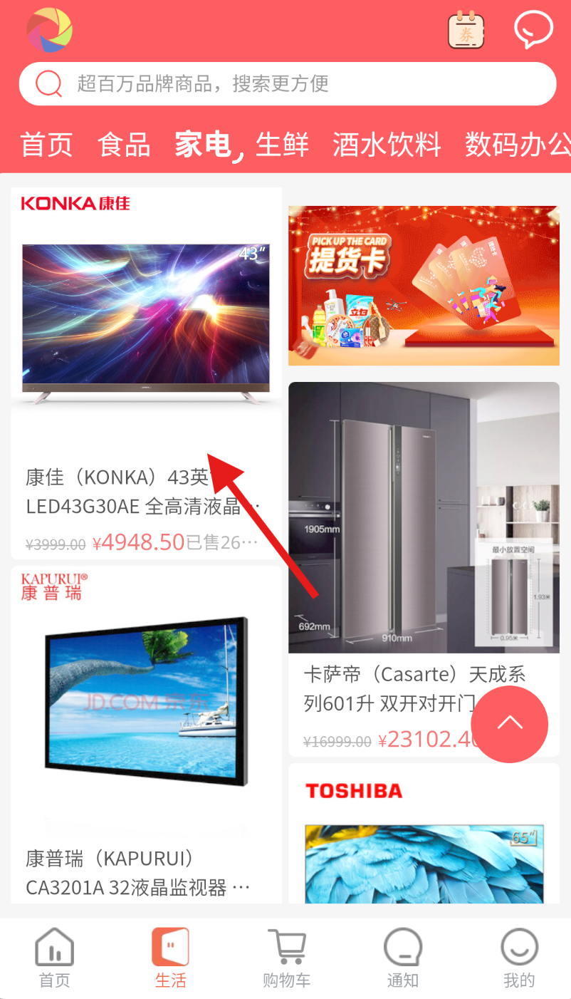 2、进入生活页面后,在页面上方找到 “家电” 选项并点击,切换至家电商品展示页面。