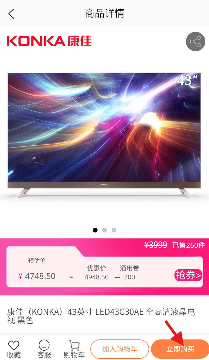 5、若确定要购买,在电视详情页面右下方找到 “立即购买” 按钮并点击,即可完成购买操作。