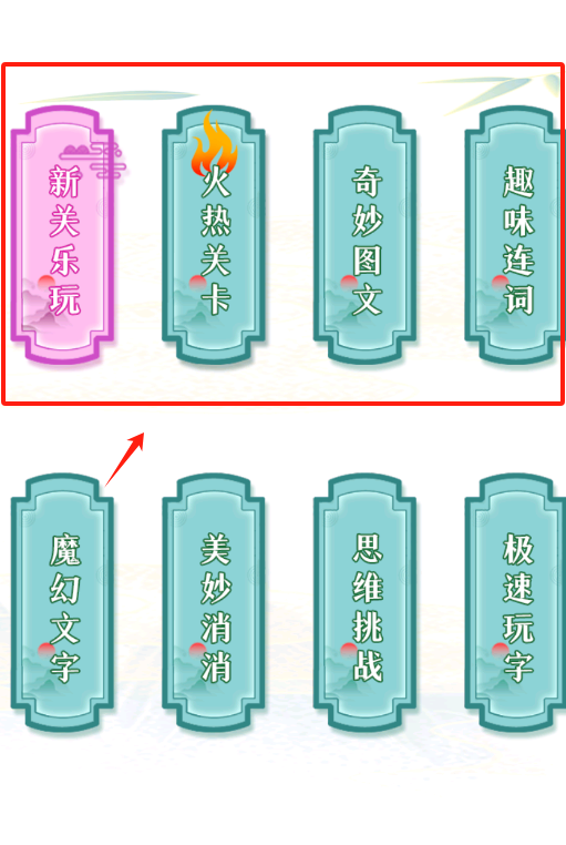 1、点粉色新关乐玩开始新关卡,或选蓝绿色选项玩火热关卡,奇妙图文等八种不同游戏模式。