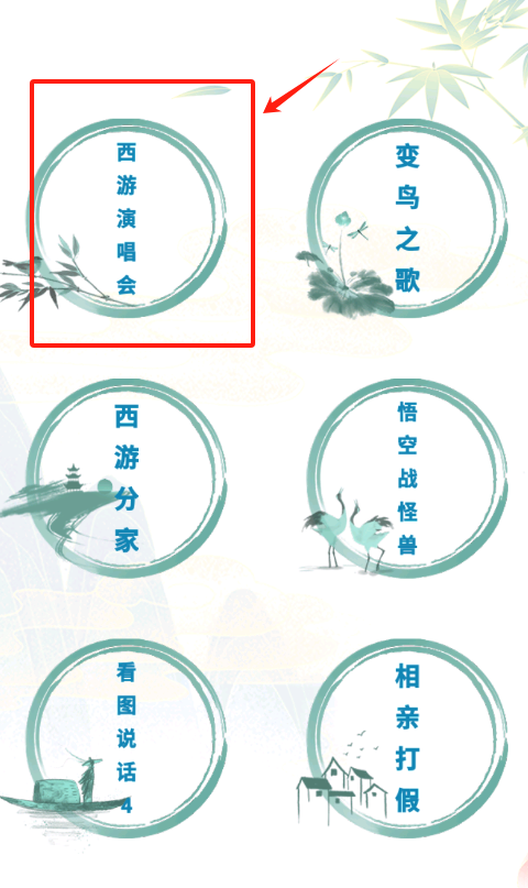 2、点红色框里的西游演唱会圆形图标,进入看图说话游戏,或选其他五个主题如变鸟之歌挑战。