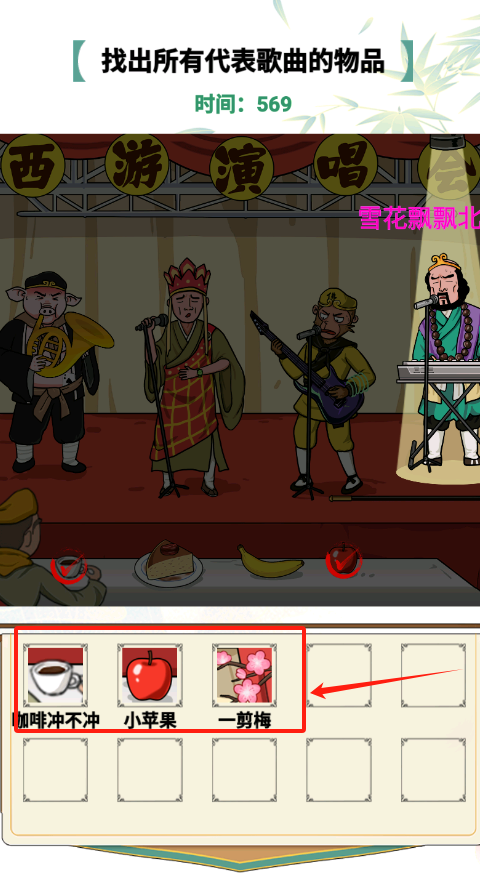 3、找西游演唱会场景中代表歌曲的物品,选一剪梅正确答案,避开咖啡冲不冲等错误选项。