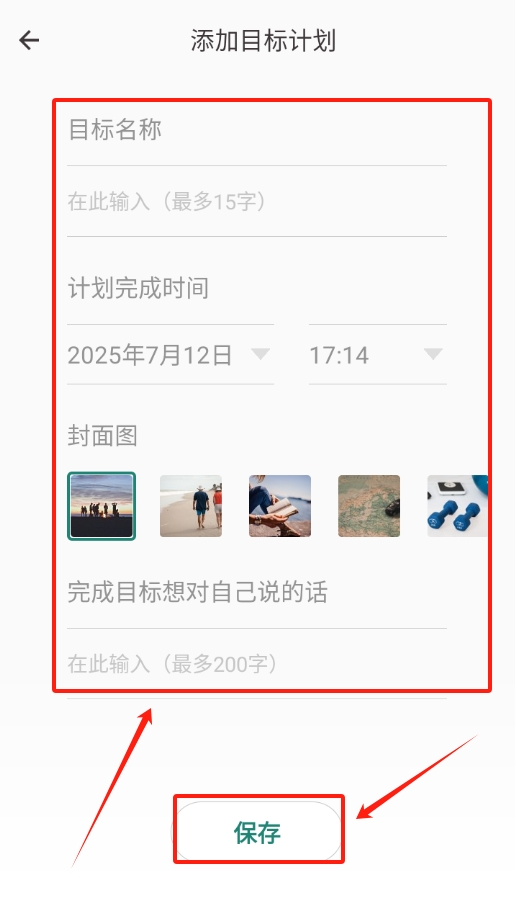 4、之后输入目标名称、计划完成的时间,还有完成目标后想对自己说的话,都填好后点击保存,目标计划就添加好了。