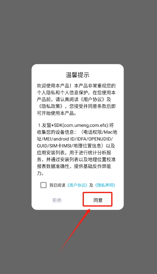1、打开软件后,会弹出软件协议内容,花几秒看一下然后点同意,这一步很关键,不完成的话就没法继续使用软件。