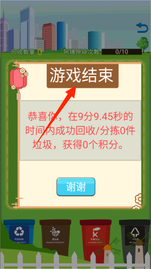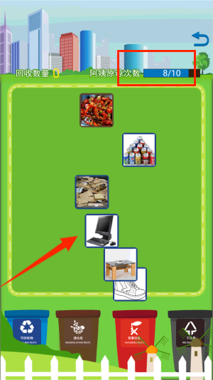 3、选定模式后,系统会随机投放各类废弃物,需要准确投放到对应回收箱中。
