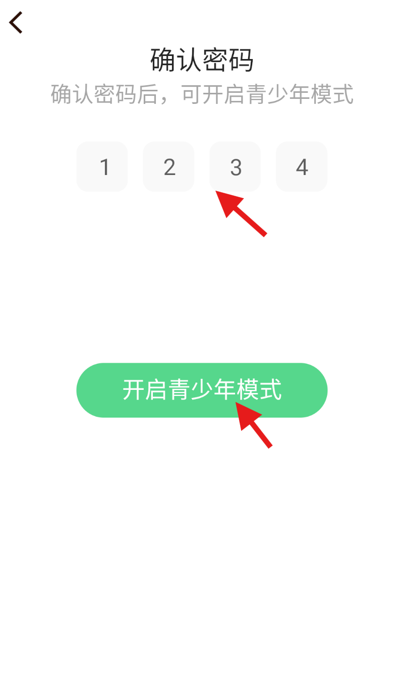 4、在弹出的页面中设置青少年模式密码,完成设置后点击 “开启青少年模式”,即可成功开启。