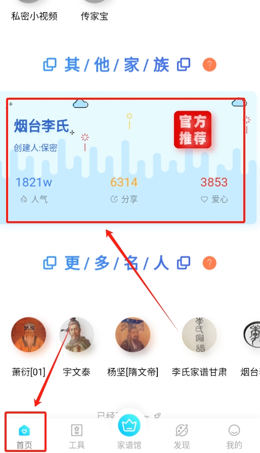 2、登录成功后回到首页,页面上会显示各个家族的家谱,找到想查看的那个家族的家谱,直接点击进去。