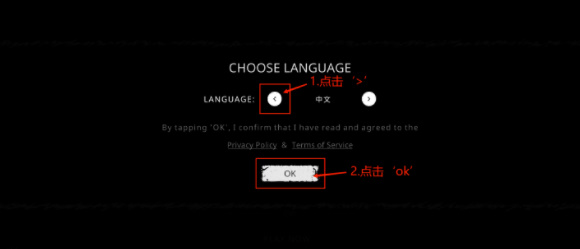 1、游戏在开始的时候,可以进行一次语言选择,通过切换为中文,然后选择中间的OK来完成中文设置。