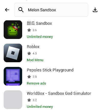 2、在搜索页面输入【Melon Sandbox】也就是甜瓜游乐场的英文命,就能获取超多的搜索结果。