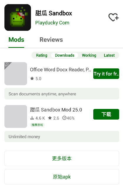 3、进入到甜瓜游乐场详情页以后,点击【下载】或者查看原始版本、更多版本。