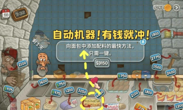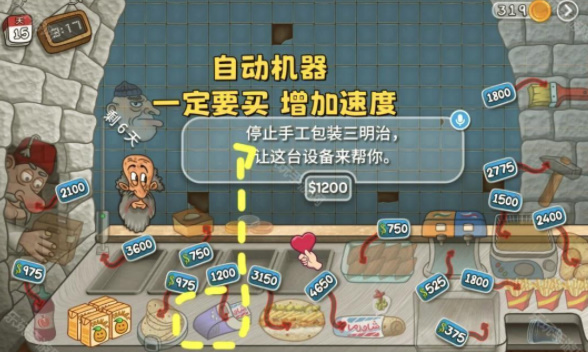 优先升级:自动烤肉机、自动包装机、自动削土豆、自动金币等设备。