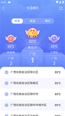 实时更新的天气排行,可以查看高温排行、低温排行和降水排行哦。