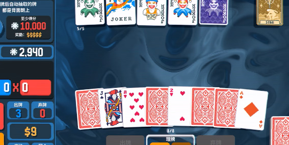 2、随着回合的深入,分数要求会持续不断的提升,发牌、弃牌等,组合牌组来获得高分。