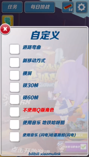 2、同时可以根据自身需求在自定义中进行不同的设置,支持使用正比例的东海帝王进行跑酷,还能勾选勾式bgm进行游戏;