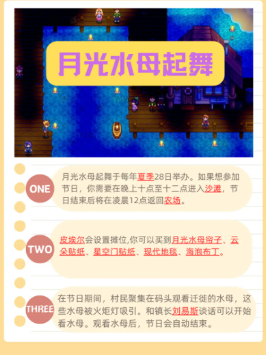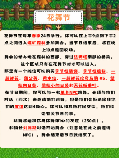 活动内容:玩家可以邀请一位好感度至少为4颗心的可结婚村民跳舞,跳舞后会增加1心的好感度。可以在展台买到蒲公英、黄水仙等装饰物。