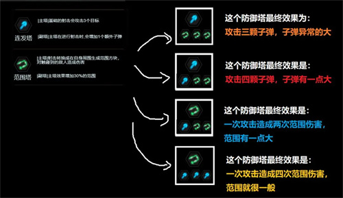 3、在一个塔基中可以同时放入一个主防御塔与三个次防御塔,构成一个整体,根据次防御塔的类型不同,主防御塔的攻击方式也会发生变化;