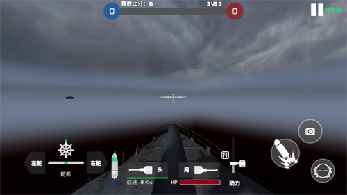 2、游戏采用第一人称视角的形式展开,通过左侧的虚拟船舵操作战舰进行移动,通过右侧的按键完成瞄准以及开火;