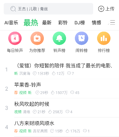 热门音乐排行榜:内置热门音乐排行榜,供用户一键设置为铃声,都是热门的资源。