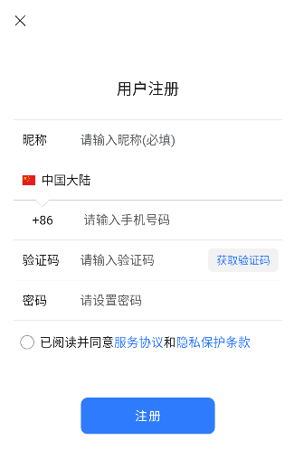 3、进入用户注册页面以后,填写相关的个人信息,使用手机号获取验证码。