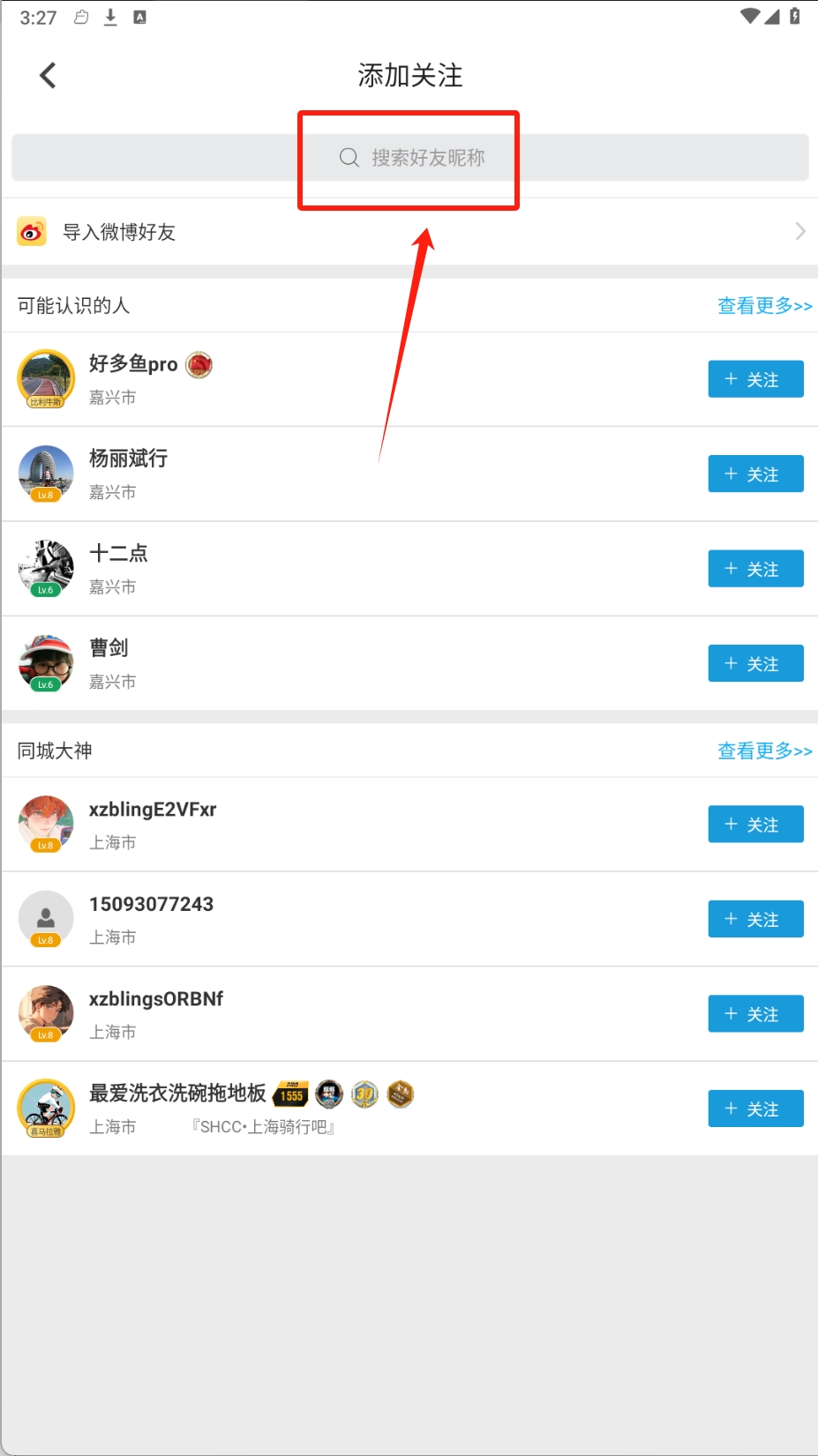 3、可以通过搜索好友昵称、关注、导入微博好友进行添加。