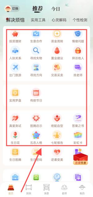 1、传统命理测算工具:提供八字排盘、姓名测试、手机号码吉凶等经典测算功能。