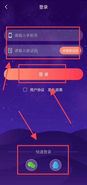 2、输入手机号和验证码,点击登录,或者快速登录选择底部两个方式。