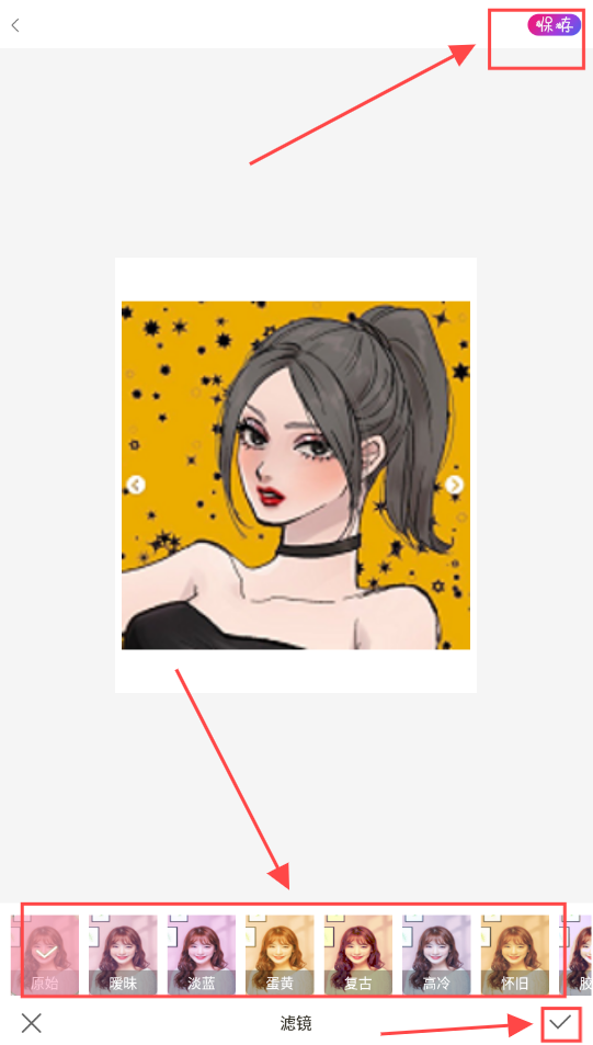 3、点击滤镜可以切换滤镜,点击右上角的保存。
