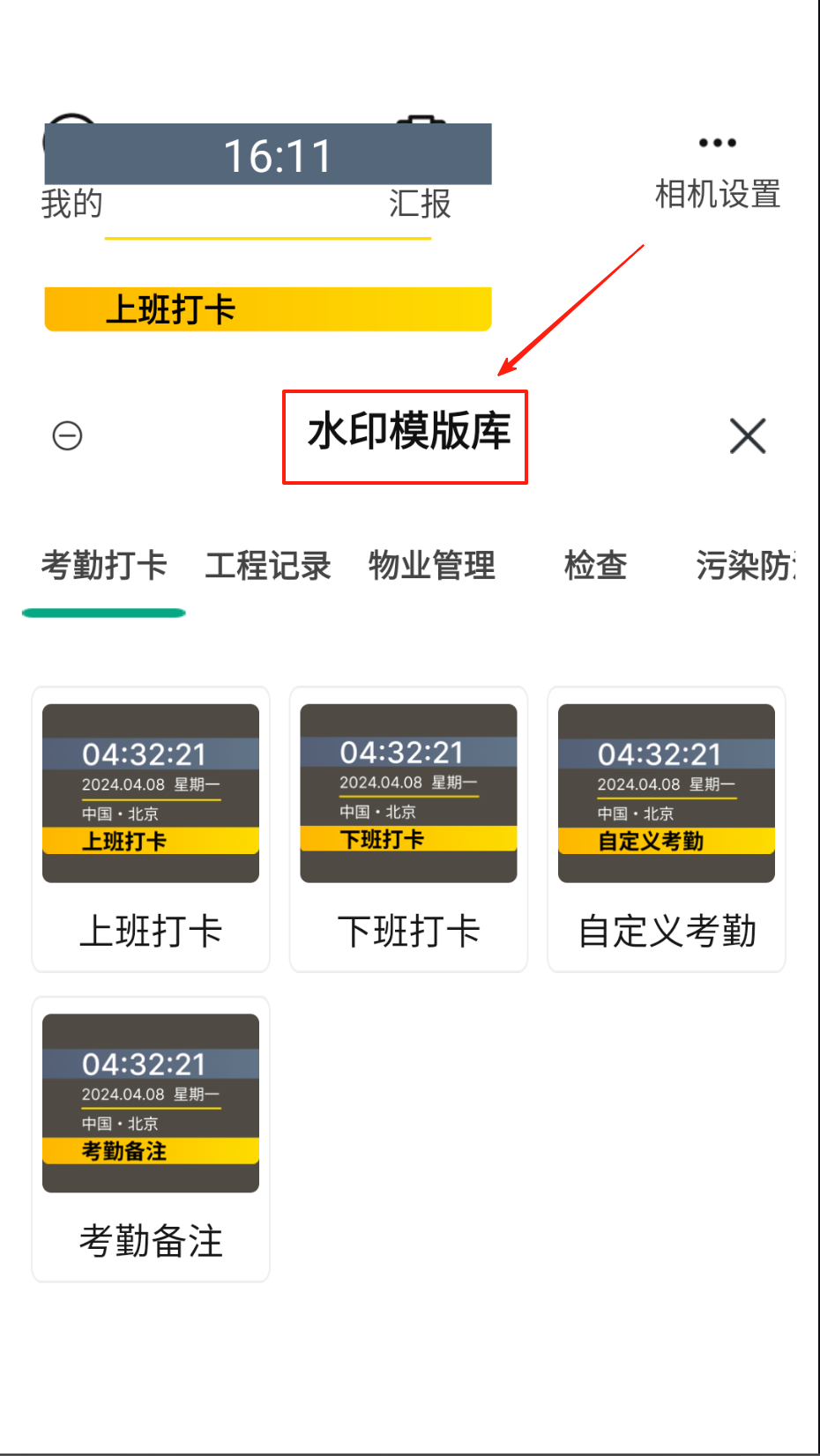 1、点击主界面模板库,选择考勤或天气等场景水印。