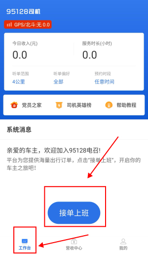 3、在工作台页面中可以点击“接单上班”,就可以上班了。