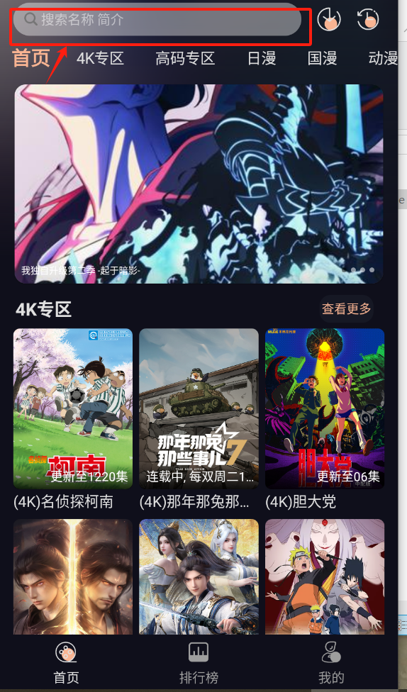 3、找到搜索栏,输入自己喜欢的动漫,就可以追剧啦。