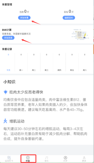 3、进入“健康”板块手动录入体重,系统自动生成曲线图与健康风险评估。