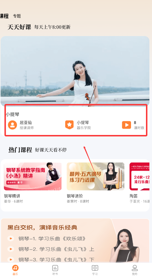 1、课程分类检索快速定位目标,按乐器类型、难度等级、教学风格等多维度筛选,帮助用户迅速找到符合自身阶段的专业教程。