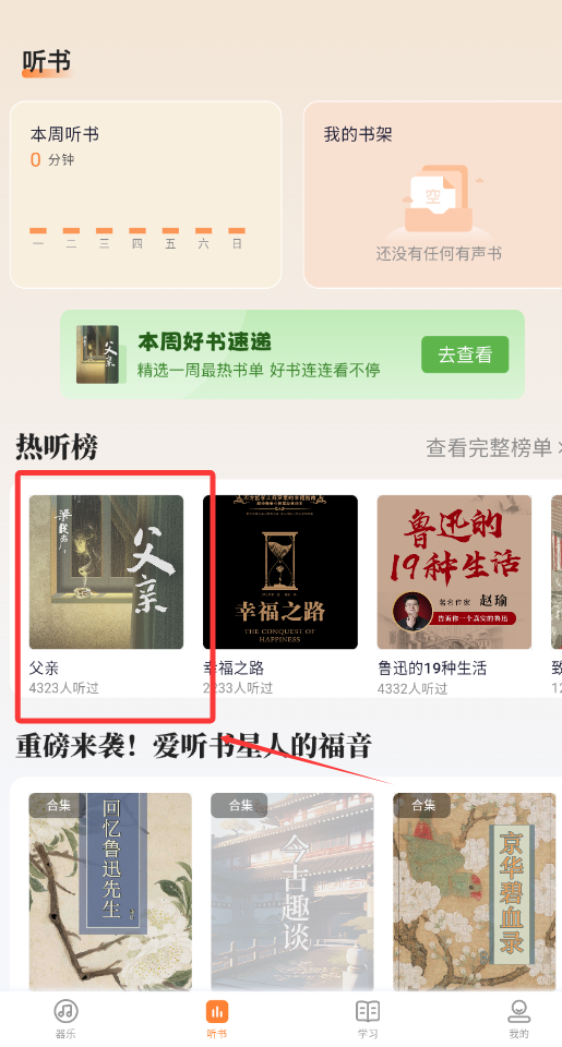 4、听书功能拓展文化视野,除乐器教学外内置优质有声书库,涵盖文学,历史,艺术等领域,辅助用户在技能训练中同步提升人文素养。