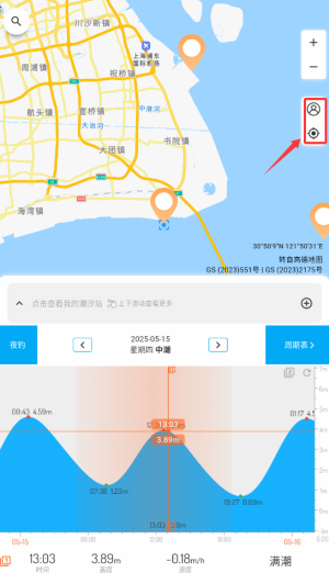 2、双指缩放电子海图查看细节,长按任意位置获取该点潮汐预测。