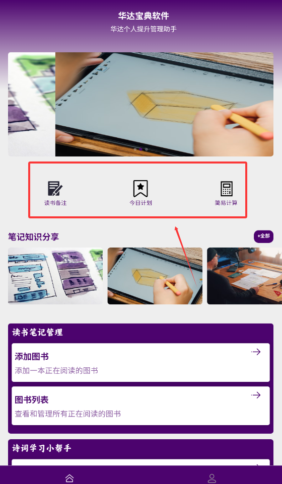 1、华达宝典将多种实用工具整合在一个平台,读书笔记,学习计划,诗词收藏等功能一应俱全,让用户无需切换多个应用就能完成知识管理。