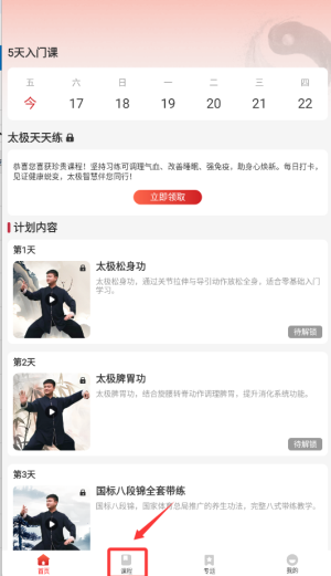 1、启动应用后,在首页选择"课程"模块进入太极教程列表。