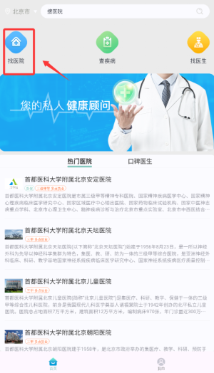 1、进入应用后,在首页选择"找医院"功能,输入目标医院名称或区域。