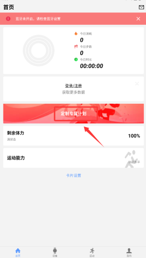 1、进入应用后,在首页选择"训练计划"功能进入定制页面。