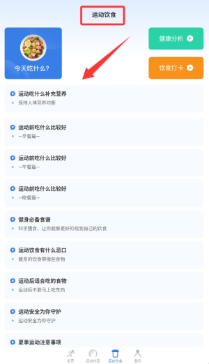 1、登录应用后,在首页导航栏选择"运动饮食"模块进入知识专区。