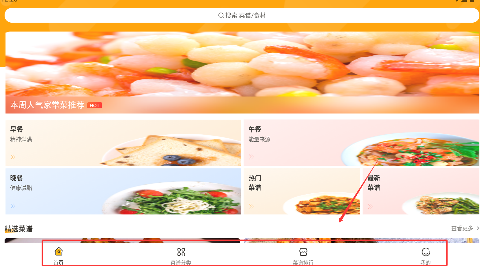 1、进入首页,可以按照以下选择点击选择,也可以按照早餐,中餐,晚餐顺序查阅翻看。