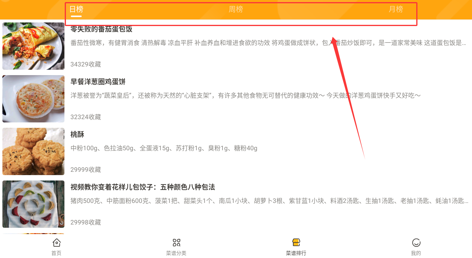 3、进入菜谱排行,可以查询日榜,周榜,月榜菜肴,点击进入即可。