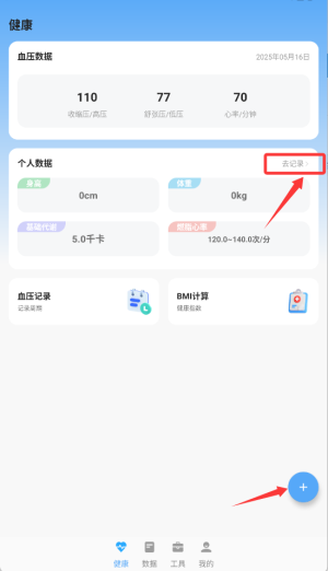 1、启动应用后,在首页选择"血压记录"功能进入数据管理页面。