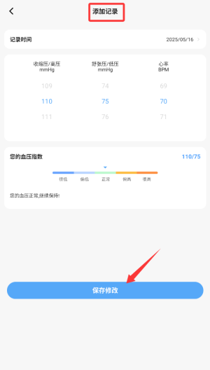2、每日测量后,点击“添加记录”输入收缩压、舒张压及心率数据。