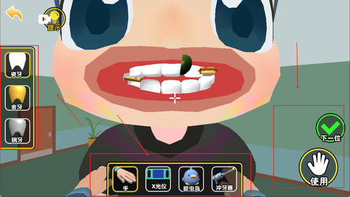 2、屏幕下侧为工具选择区域,右侧为操作界面,配合点击与滑动完成各种精细动作,如注射麻醉剂、清除蛀牙、安装假牙等。