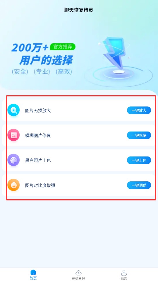 1、打开聊天恢复精灵APP,首页就能看到各种功能,选你要用的那个点进去。