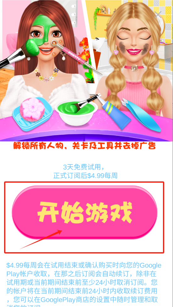 1、游戏界面,左边女孩敷面膜,右边女孩清洁脸。下方有解锁全部需去广告提示,点粉红开始游戏按钮就能玩。