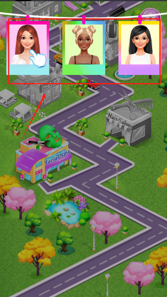 2、游戏主场景,上方有三张可点击的人物卡片。画面下方是游戏街道,有粉色美容店、灰色美发店和蓝色Spa馆,点击卡片可切换角色。